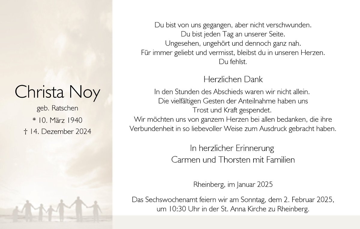 wir wünschen Ihnen für die kommende Zeit viel Kraft und dass es Ihnen gelingt, dankbar auf die positiven Erinnerungen zurückzublicken. Diese Gedenkseite möge Ihnen dabei helfen, Ihre Trauer zu teilen und das Andenken gemeinsam wachzuhalten.